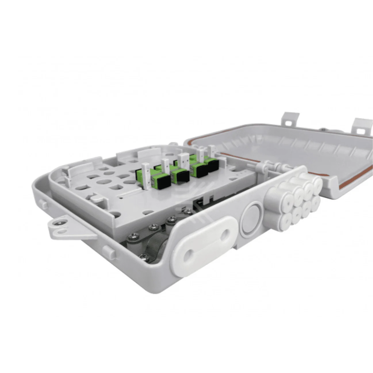Оптическая кросс-муфта — предназначена для соединения и коммутации магистральных и абонентских оптических кабелей с защитой сварных соединений. Конструкция предусматривает ввод 2 линейных кабелей и до 8 абонентских отводов, откидную монтажную панель для установки до 8 адаптеров SC/LC Duplex, места для защитных гильз и оптических делителей. Оснащена кронштейнами для настенного монтажа.