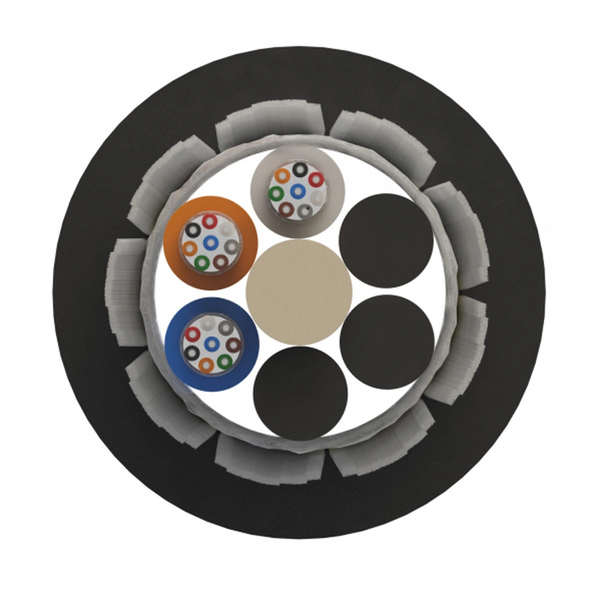 Оптический кабель модульной конструкции имеет сердечник с центральным стеклопластиковым элементом, вокруг которого скручены оптические модули и кордельные заполнители. Пространство внутри заполнено гидрофобным наполнителем. Кабель усилен скрепляющей обмоткой, водоблокирующей лентой и стеклонитевыми силовыми элементами, наружная оболочка — полиэтиленовая или безгалогенный компаунд, не распространяющий горение. Используется для ВОЛС и магистральных сетей.